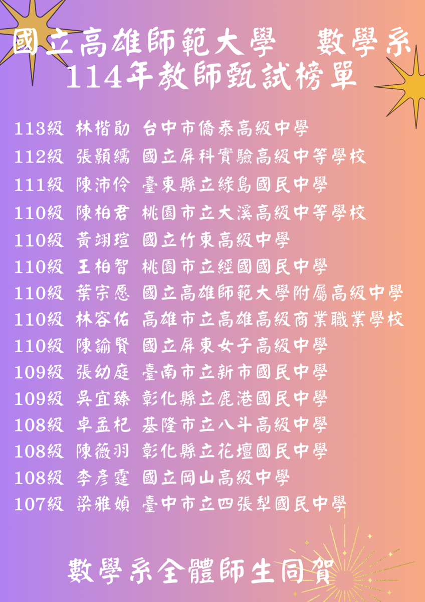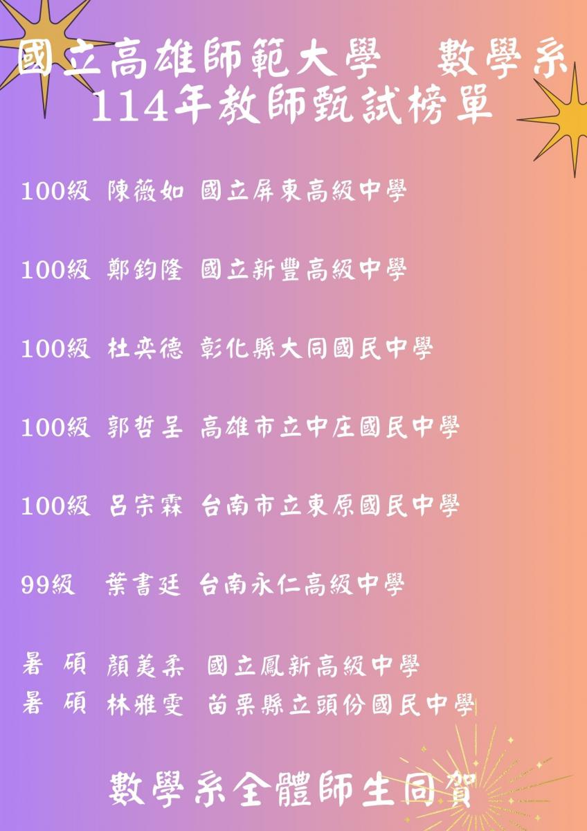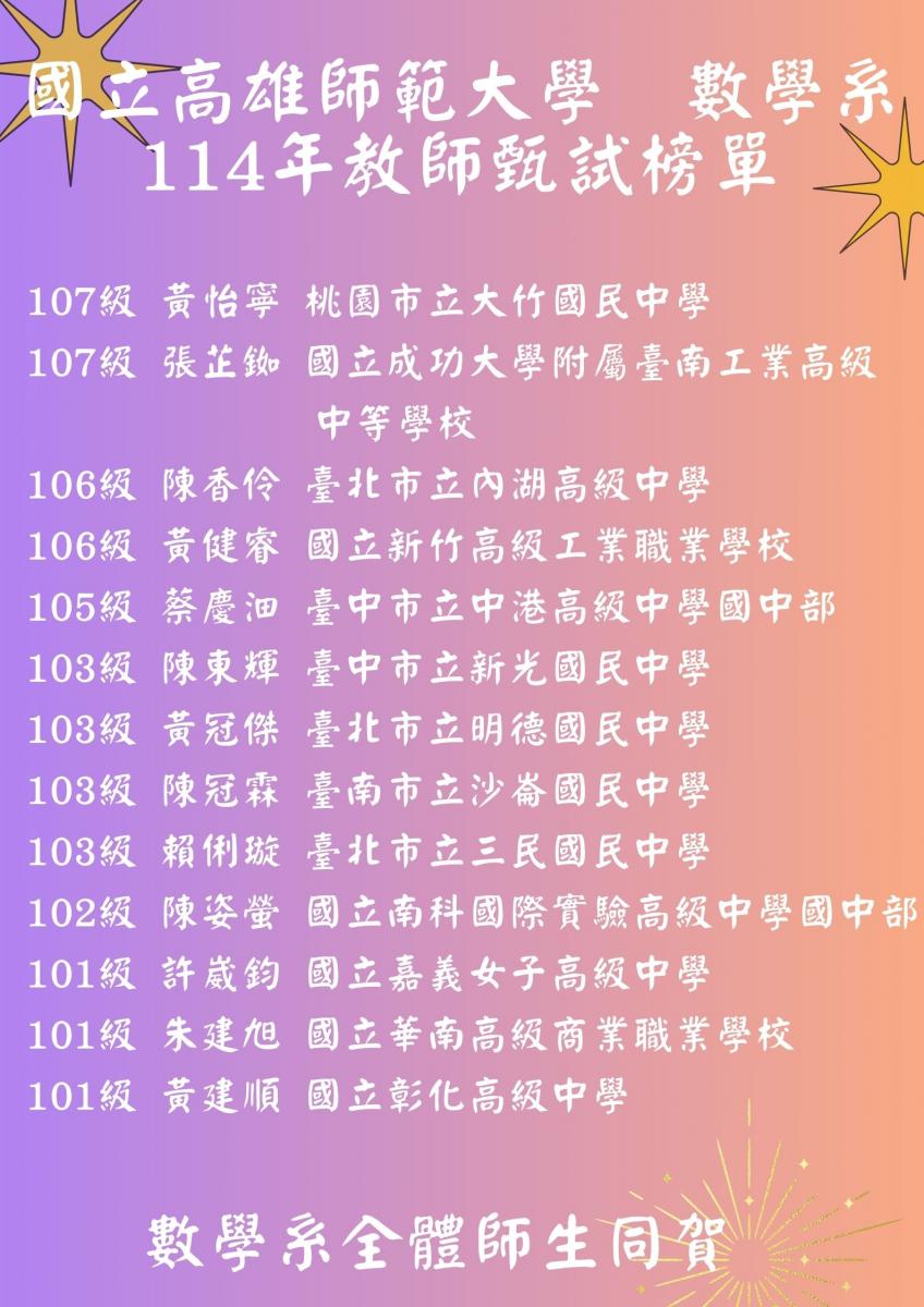 恭賀 數學系 114年考取正式教師榜單