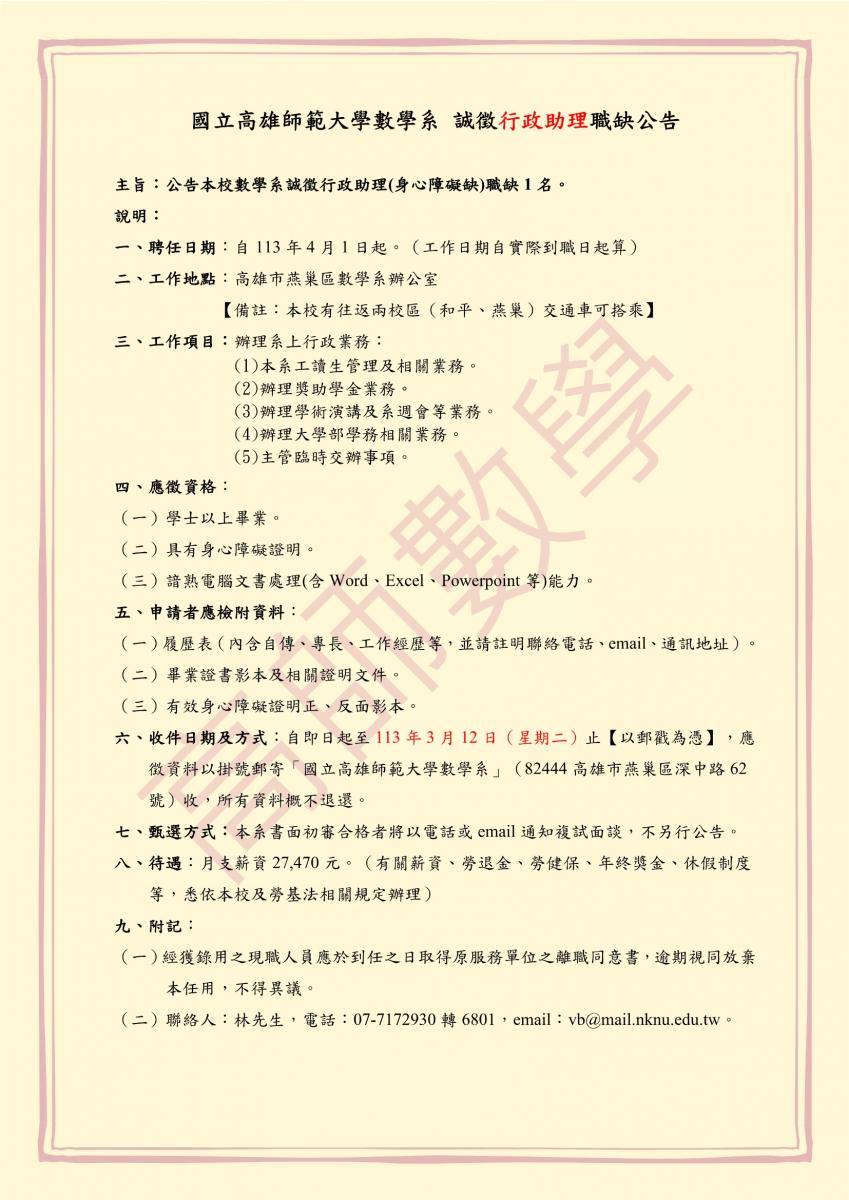 本校數學系誠徵行政助理(身心障礙缺)職缺1名