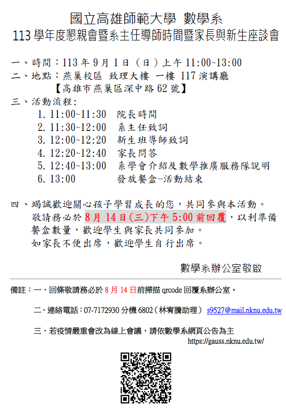 113學年度懇親會暨系主任導師時間暨家長與新生座談會