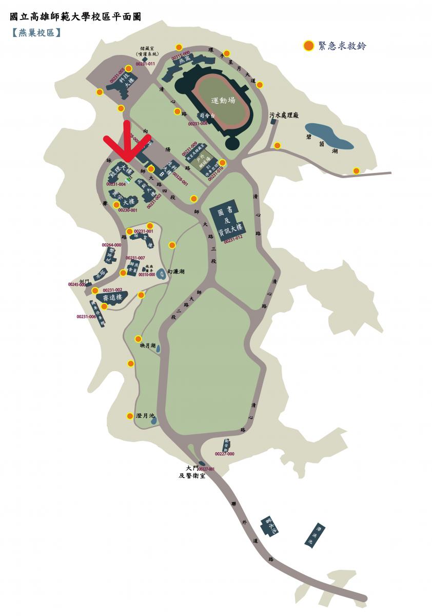 本系位罝 資訊來源:https://w3.nknu.edu.tw/zh/nknu_map 交通資訊 行經燕巢校區公車班次 (資訊來源: 總務處事務組) 港都客運 7A路線 時刻表 路線圖 高雄客運 E04燕巢學園快線 時刻表 路線圖 統聯客運 E09A前鎮燕巢城市快線 時刻表 路線圖 開車路線 (資訊來源: https://w3.nknu.edu.tw/zh/go_nknu) 前往高雄師大燕巢校區之高速公路路線: 一、由南二高轉國道十號至燕巢交流道下(或中山高速公路至【鼎金系統交流道】,再由鼎金系統交流道轉進入十號國道),至燕巢交流道下,左轉約一公里又轉進入旗楠公路(往里港方向)直行約五公里,見深水國小天橋後即左轉本校聯外道路橋樑,進入燕巢校區。 二、中山高速公路於楠梓交流道下,轉旗楠公路進入燕巢校區。 (資訊來源: 總務處事務組)